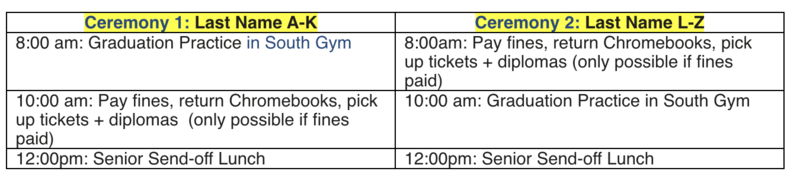 Graduation Practice will be held on June 9th (Wednesday), so clear your schedules! This is the same day as your senior send-off lunch, day to pick up grad tickets, return Chromebooks, etc. ATTENDANCE AT THIS EVENT IS MANDATORY IF YOU PLAN TO WALK AT COMMENCEMENT.