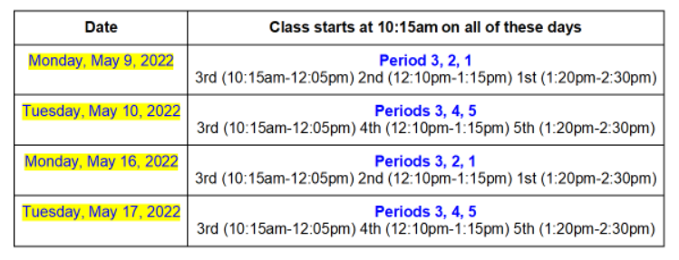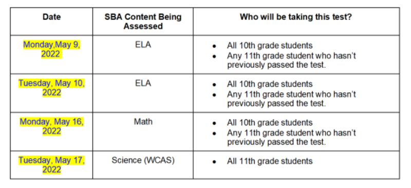 We will be conducting state SBA testing on May 9, 10, 16 and 17. We will be on a late start for these four days, and classes will start at 10:15am. Below is the schedule for who needs to test on which days of the schedule. Testing starts at 7:50am.